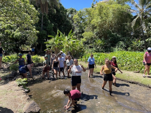 Ka Papa Loʻi O Kānewai offered the opportunity for us students to learn about traditional Hawaiian agricultural practices of the loʻi and their importance in Hawaiian culture. We first gathered to hear about the legends of Kāne and Kanaloa and their significance to the source of life (water) for agriculture. Our guides lined us up to journey through the forest path alongside the Manōa stream to examine the topography and water partitioning techniques used to create the loʻi and listen to the history. We had fun collecting the leaves for fertilizer, stomping our way through the mud, and weeding the lo‘i. After a morning of hard work, we were pleasantly greeted to lunch with kalua pork, sweet pudding, and kalo.