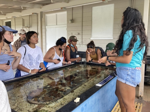 We spent the day snorkeling and touring Moku o Lo‘e (Coconut Island), which is a Hawaiʻi Institute of Marine Biology research facility. We started off the day snorkeling right off one of the island's docks and got to learn about different sea life and species of coral. During lunch we had a chance to try to identify some of the fish that we saw in a book given to us by our guide. After that, we got a tour of the labs on the island, got a brief introduction on what each lab is studying, and had time to read some posters from each lab. We got to see all kinds of little sea creatures in the touch tank, the pool where one lab keeps sharks to study, and coral nursery tanks. Overall it was a hot, but incredibly informative and fun experience.
